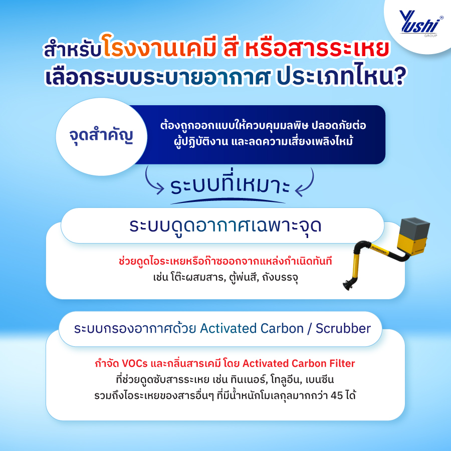 โรงงานเคมี สี หรือสารระเหย จะมีความเสี่ยงสูงเรื่องไอระเหยสารเคมี (VOCs), ก๊าซพิษ, กลิ่นแรง และการติดไฟ / ระเบิด ดังนั้นระบบระบายอากาศต้องถูกออกแบบให้ควบคุมมลพิษ ปลอดภัยต่อผู้ปฏิบัติงาน และลดความเสี่ยงเพลิงไหม้